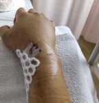 肘まで腫れて、二の腕も鬱血してます